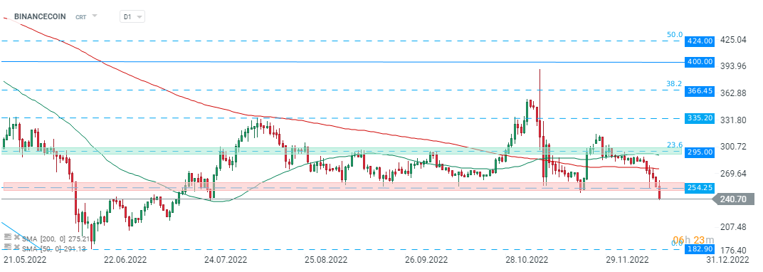 BINANCECOIN spadł dzisiaj o ponad 6,0% i przebił się poniżej kluczowego wsparcia na poziomie 254,25 USD, które w przeszłości kilkakrotnie powstrzymało spadki. Jeśli obecny sentyment się utrzyma, ruch spadkowy może przyspieszyć w kierunku wsparcia na poziomie 182,90 USD, gdzie znajdują się minima z czerwca 2022 roku. źródło: xStation5.