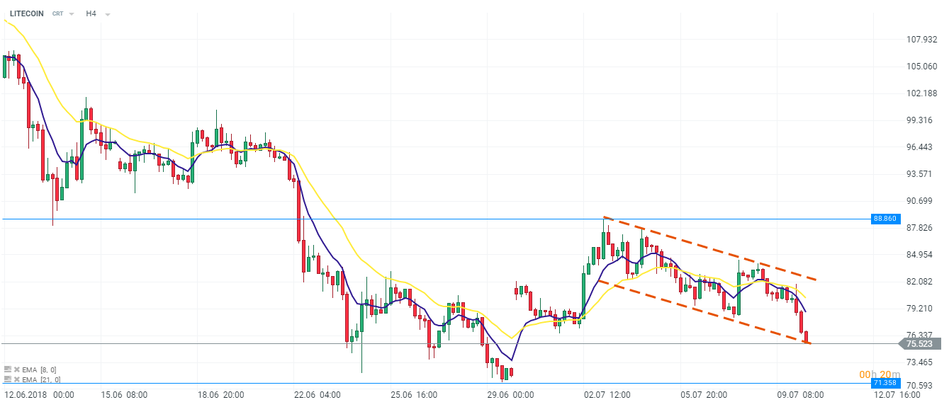 LITECOIN znajduje się trochę powyżej 75 dolarów. Kryptowaluta zbliża się do swojego poziomu wsparcia (niżej położona linia obszaru spadkowego). Możliwe przełamanie może sygnalizować zmianę trendu. Źródło: xStation5