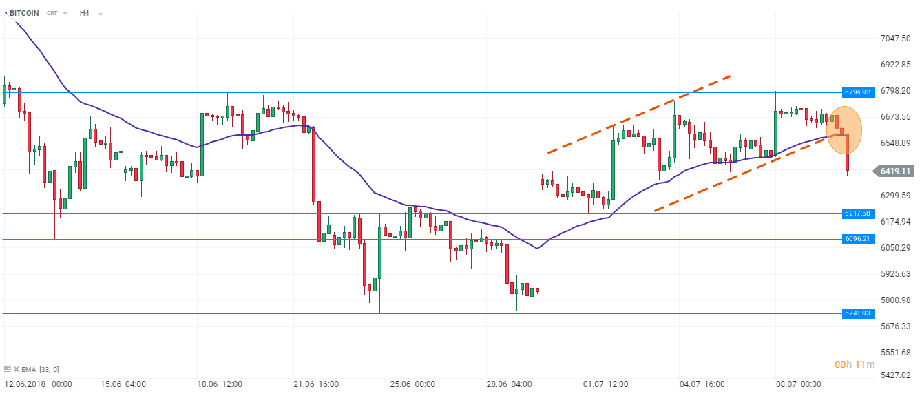 BITCOIN zanotował wyraźną stratę. W ostatnim czasie przełamał 33-okresową średnią kroczącą na wykresie H4 (fioletowa linia na wykresie). Obecnie najpopularniejsza kryptowaluta znajduje się na niewiele poniżej poziomu 6550 dolarów. Źródło: xStation5