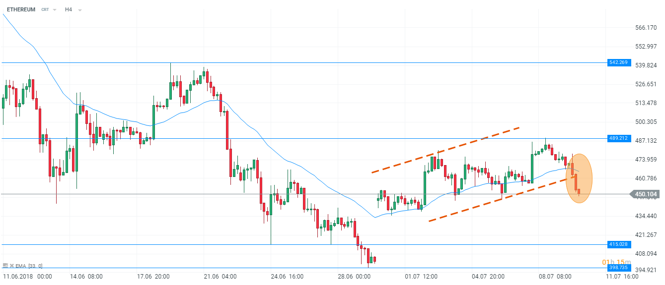 ETHEREUM również doświadczyło sporej straty. Podobnie jak Bitcoin, Ethereum przełamało swoją 33-okresową średnią kroczącą na wykresie H4 (niebieska linia), choć zdecydowanie mocniej niż było to w przypadku Bitcoina. Obecnie cena Ethereum znajduję się na poziomie około 450 dolarów. Spadki, które widzimy w bieżącym tygodniu, mogą sugerować rozwój nowego trendu spadkowego. Źródło: xStation5
