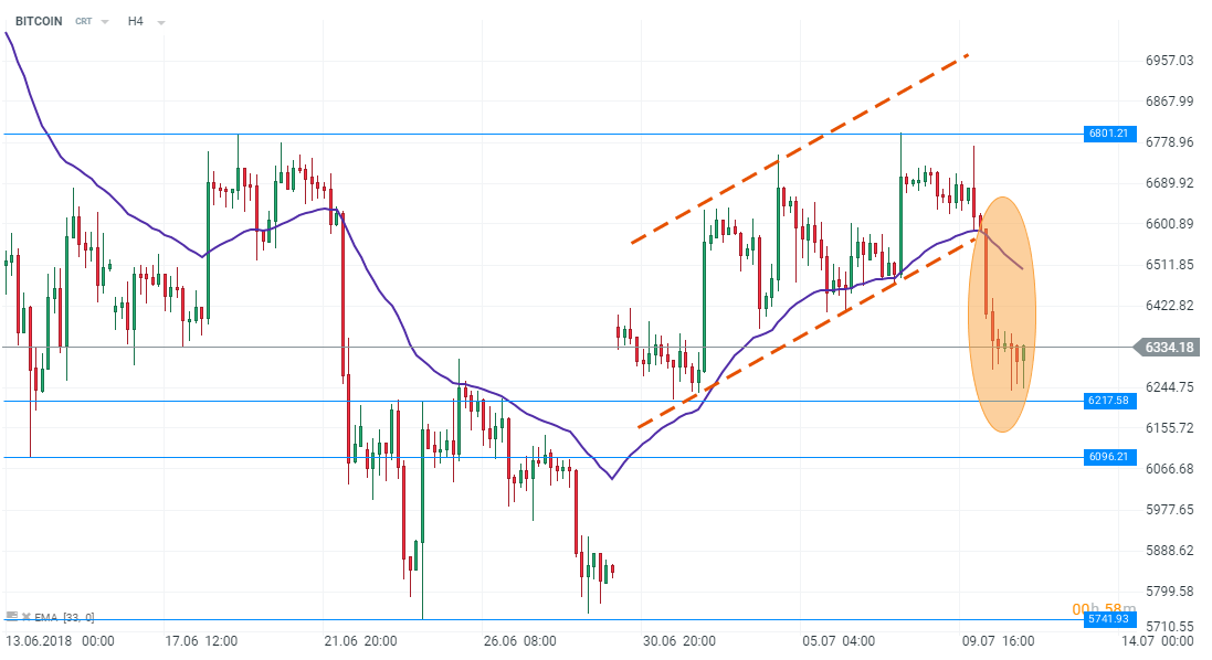 Najbardziej popularna kryptowaluta spada w tym tygodniu. BITCOIN w dniu dzisiejszym znajduje się niewiele powyżej 6300 dolarów. Na wykresie H4 możemy zaobserwować całkiem wyraźne przełamanie 33-okresowej średniej kroczącej (fioletowa linia). Możliwe, że obecne ruchy cenowe mogą prowadzić do powstania nowego trendu spadkowego. Źródło: xStation5