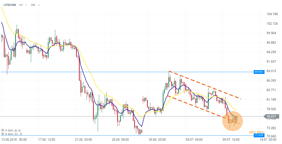 Wczoraj LITECOIN testował dolną linię obszaru spadkowego (pomarańczowy obszar). Obecnie waluta cyfrowa powróciła do wspomnianej strefy. Cena kryptowaluty obecnie znajduje się w okolicach 75 dolarów. Kanał spadkowy nie został w wyniku ostatnich wahań wyraźnie przełamany. Możemy więc przypuszczać, że kryptowaluta będzie kontynuowała wcześniejsze ruchy. Źródło: xStation5