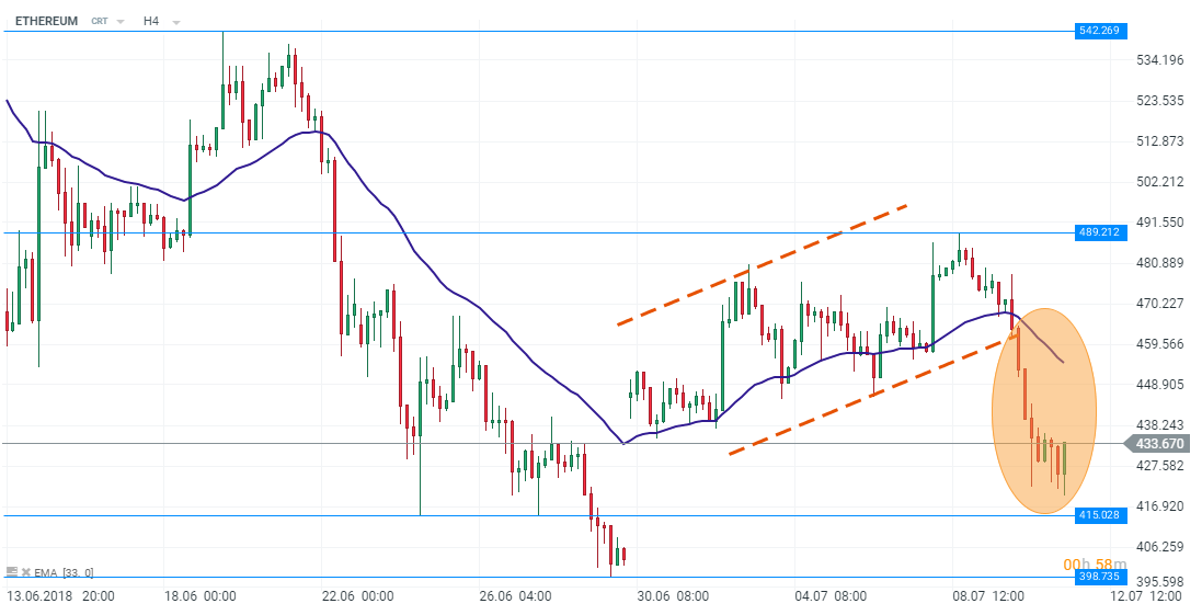 ETHEREUM, podążając w jednym kierunku z Bitcoinem, wciąż idzie w dół. Obecnie jego cena znajduje się niewiele powyżej 430 dolarów. Podobnie jak Bitcoin, Ethereum dosyć wyraźnie przełamała 33-okresową średnią ruchomą na wykresie H4 (fioletowa linia na wykresie). Wydaje się, że wcześniejszy trend został trwale porzucony przez kryptowalutę. W najbliższych dniach sytuacja prawdopodobnie wyklaruje się nieco bardziej. Źródło: xStation5