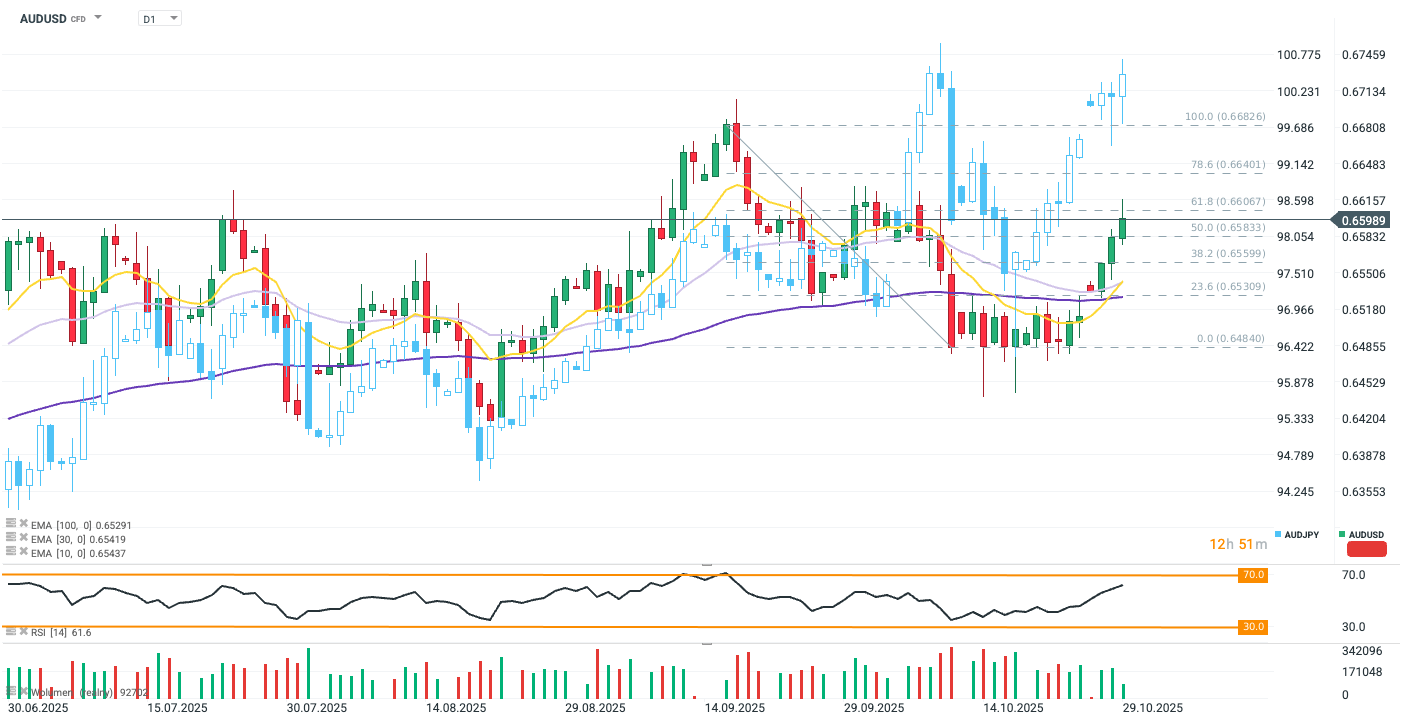 AUDUSD przebił się dzisiaj przez poizom 50 zniesienia Fibonacciego ostatniej fali spadkowej, odbijając się jednak od oporu w okolicach ostatnich szczytów przy 0.66. Silny “risk-on” widać również na AUDJPY (na niebiesko). Źródło: xStation5
