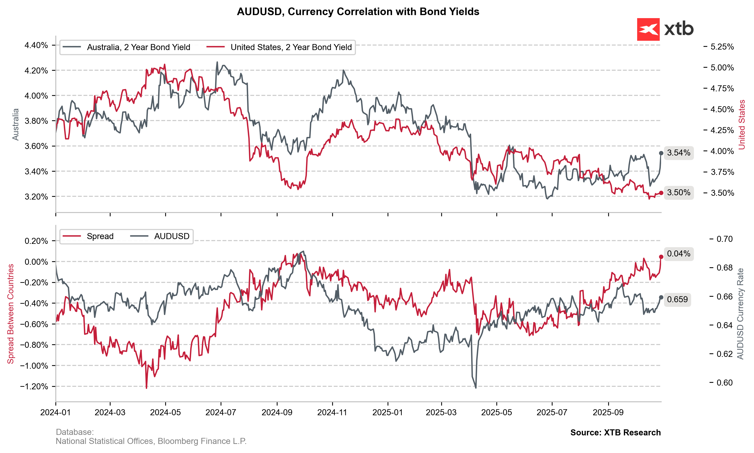Rentowności australijskich 2-latek wzrosły od początku tygodnia o ok. 20 pb, szybując do najwyższego poziomu od maja 2025. AUDUSD wyraźnie zawraca w stronę spreadu rentowności po krótkim okresie stagnacji. Źródło: XTB Research na podstawie danych Bloomberg.
