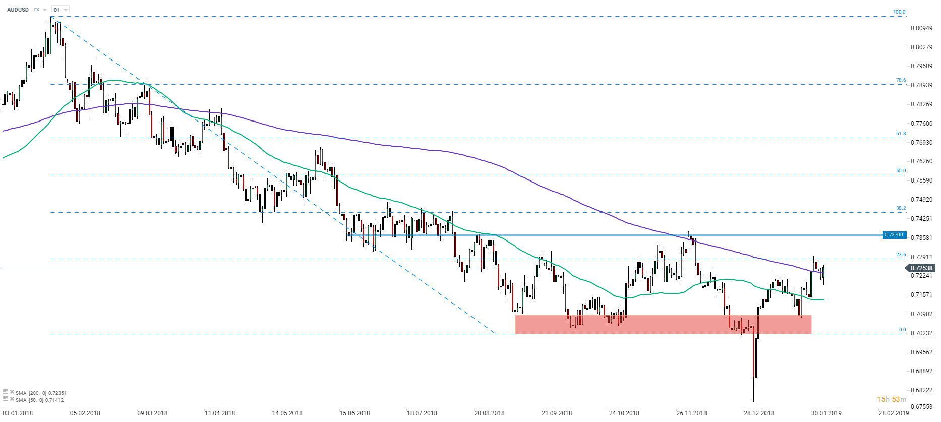 AUDUSD zdołał złamać strukturę trendu spadkowego, w którym znajdował się przez praktycznie cały 2018 rok. Ostatni impuls wzrostowy został zatrzymany przez zniesienie 23,6% ruchu spadkowego od początku 2018 roku. Jeśli uda utrzymać się dobry sentyment wobec dolara australijskiego i przebić powyżej wspomnianego poziomu Fibo, kolejny przystankiem dla byków mógłby być okolice poziomu 0,7370. Źródło: xStation5