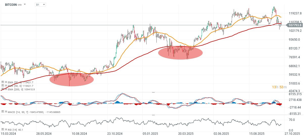 Cena Bitcoina spada dziś o prawie 3% i cofa się do 107 tys. dolarów, choć Wall Street utrzymuje wczorajsze wzrosty, a ogólne nastroje na rynkach wydają się optymistyczne, wobec zaplanowanego na przyszły tydzień spotkania Trumpa z XI, w Seulu. Mimo to Bitcoin wznowił dziś spadki i przebił się poniżej kluczowego wsparcia, w postaci EMA200 (czerwona linia; okolice 109,5 tys. USD), potencjalnie sugerując średnioterminową słabość. Patrząc na skalę poprzednich tego rozmiaru korekt, widzimy, że jeśli trend spadkowy utrzyma się, realny może okazać się test kluczowego poziomu 100 tys. dolarów. Presja może pochodzić także ze strony krótkoterminowych inwestorów, którzy notują średnio kilkuprocentową stratę; średnia zakupu BTC w tej grupie wynosi ponad 113 tys. USD wg. danycb BGeometrics (STH Realized Price). Istotny opór to obecnie ponownie 'okrągłe' 110 tys. dolarów. Bitcoinowi nie pomogły nawet informacje o zakupach kolejnych BTC przez Microstrategy, a aktywność zakupowa funduszy ETF osłabła.