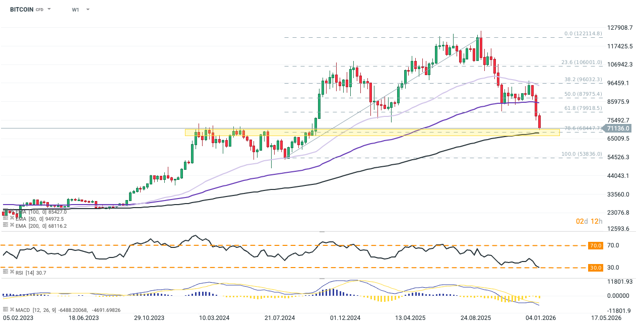 BITCOIN znajduje się w silnej fazie spadkowej, tracąc około 42% od szczytu z października. Cena przełamała kluczowe wsparcia i obecnie handluje w okolicach 71 150 USD, oscylują w pobliżu psychologicznej bariery 70 000 USD. MACD wykazuje silny trend spadkowy, z histogramem głęboko poniżej linii zero. Trwałe zejście poniżej 70 000 USD może otworzyć drogę do testu poziomu 68 000 USD (żółta strefa) lub nawet długoterminowego wsparcia przy 54 000 USD. Źródło: xStation5