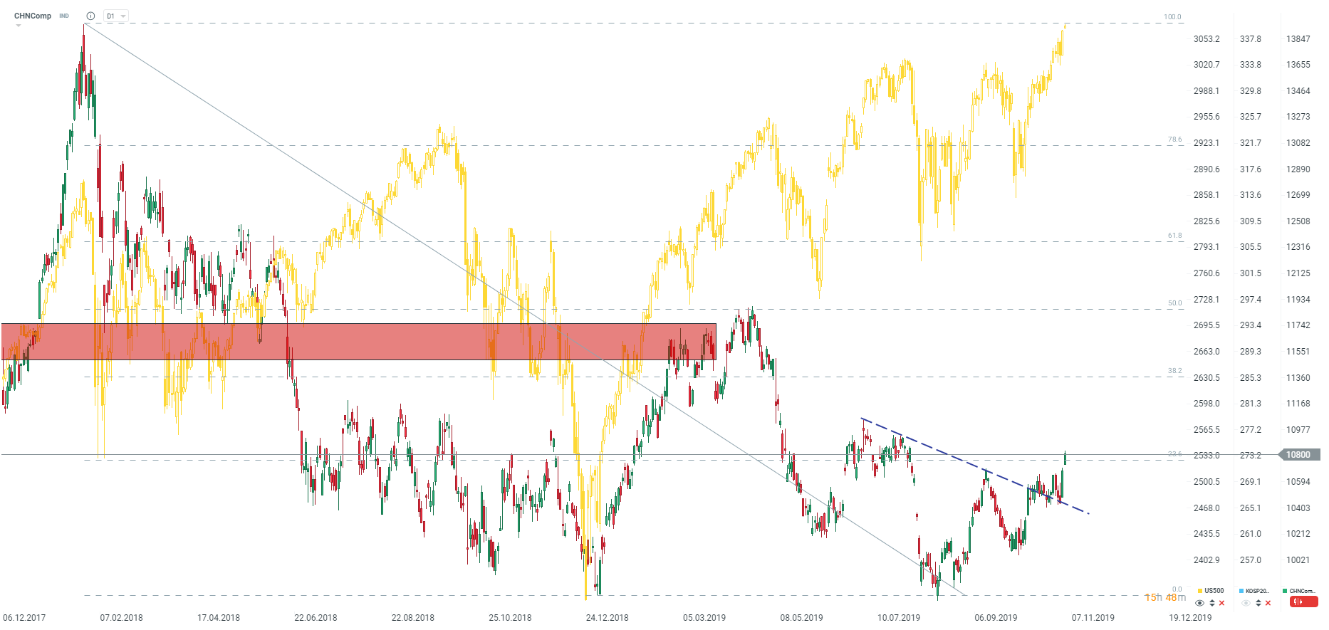 Indeks CHNComp kontynuuje wyraźne odbicie. Kolejny ważny poziom oporu to 11 tys. punktów. Źródło: xStation5