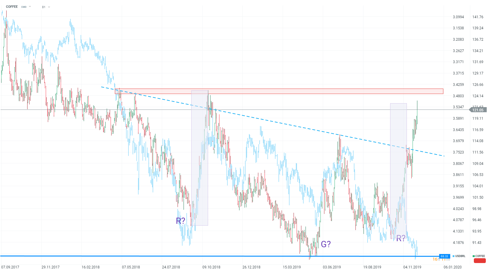 Wczoraj oczywiście wszystkie oczy zwrócone były na korektę na giełdach, w drugim rzędzie może ewentualnie na dolara, ale warto też nie pominąć rynku kawy, której cena bardzo mocno ostatnio drożała. Zasięg ruchu jest podobny do tego z jesieni ubiegłego roku, kiedy ostatecznie cały ruch został wymazany. To nie jedyny opór – przed kawą też strefa $125, ponad którą cena nie wzrosła od stycznia 2018 roku. Obecny wzrost był napędzany zamykaniem pozycji krótkich, przez co kawa zaczyna wyglądać na wykupioną. Jednak jest jeden czynnik, który może pomóc kupującym – poprzednie odbicia na kawie napędzane były umocnieniem reala. Teraz brazylijska waluta jest bardzo słaba (co zresztą wczoraj Brazylii wypomniał Trump) – gdyby real zaczął zyskiwał, kawa dostałaby nowego sojusznika. Przełamanie bariery 125 mogłoby wygenerować odbicie z prawdziwego zdarzenia, jakiego nie widzieliśmy od 2016 roku.