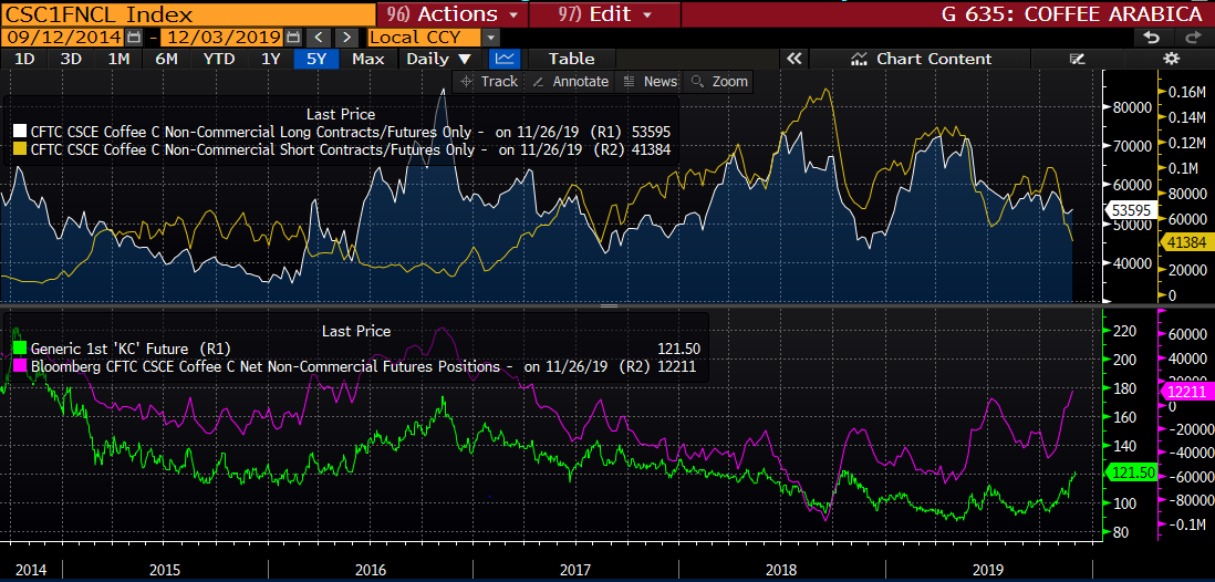 Pozycjonowanie może zacząć ciążyć cenom kawy. Źródło: Bloomberg, Dział Analiz XTB