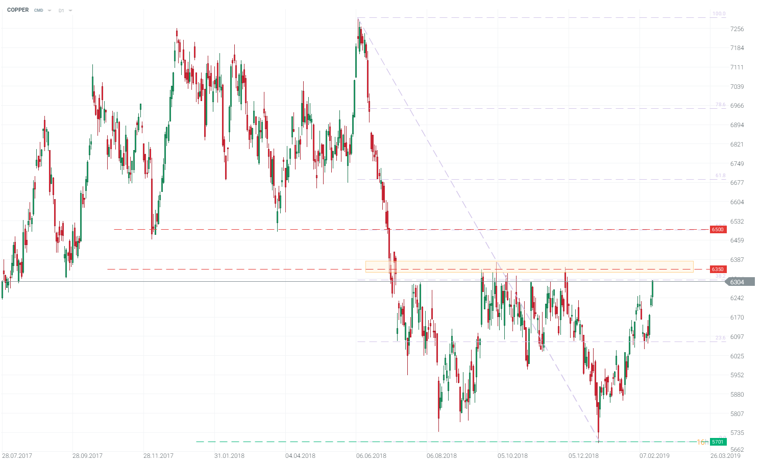 Ceny miedzi na początku roku zanotowały wielomiesięczny dołek, nadal jednak sporo powyżej poziomów z 2015 roku. Od tego czasu tona miedzi zdrożała jednak o 600 dolarów, korzystając przede wszystkim na lepszych nastrojach (odbicie na giełdach, spory zastrzyk płynności ze strony banku centralnego Chin) i obecnie jest bardzo blisko ważnego oporu na poziomie 6350 dolarów. W zasadzie cała druga połowa ubiegłego roku upłynęła na bezskutecznej próbie forsowania tej bariery, dlatego należy spodziewać się przynajmniej próby kontry ze strony podaży. Kolejny opór (słabszy) jest na poziomie 6500 dolarów.
