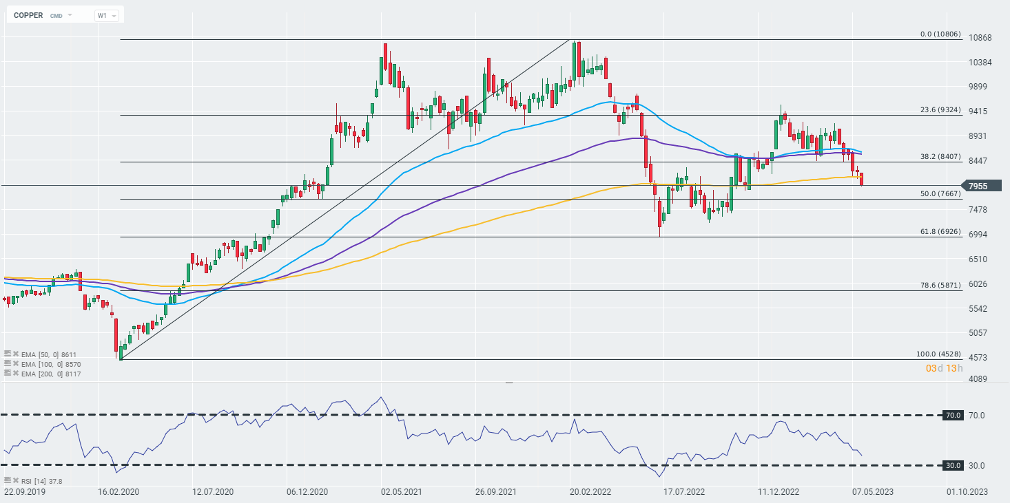 Wykres notowań COPPER na interwale D1. Ceny miedzi w chwili obecnej spadają poniżej psychologicznej bariery 8000 dolar i wybijają się poniżej 200- dniowej, wykładniczej, średniej kroczącej (złota krzywa), która w chwili obecnej stanowi główny punkt kontrolny definiujący dalsze ruchy na instrumencie. Następnym poziomem wsparcia jest 50% zniesienie Fibo fali zapoczątkowanej w lutym 2020 roku. Lokalnym oporem jest wcześniej wspomniany poziom 8000 USD oraz 200-EMA. Źródło: xStation5