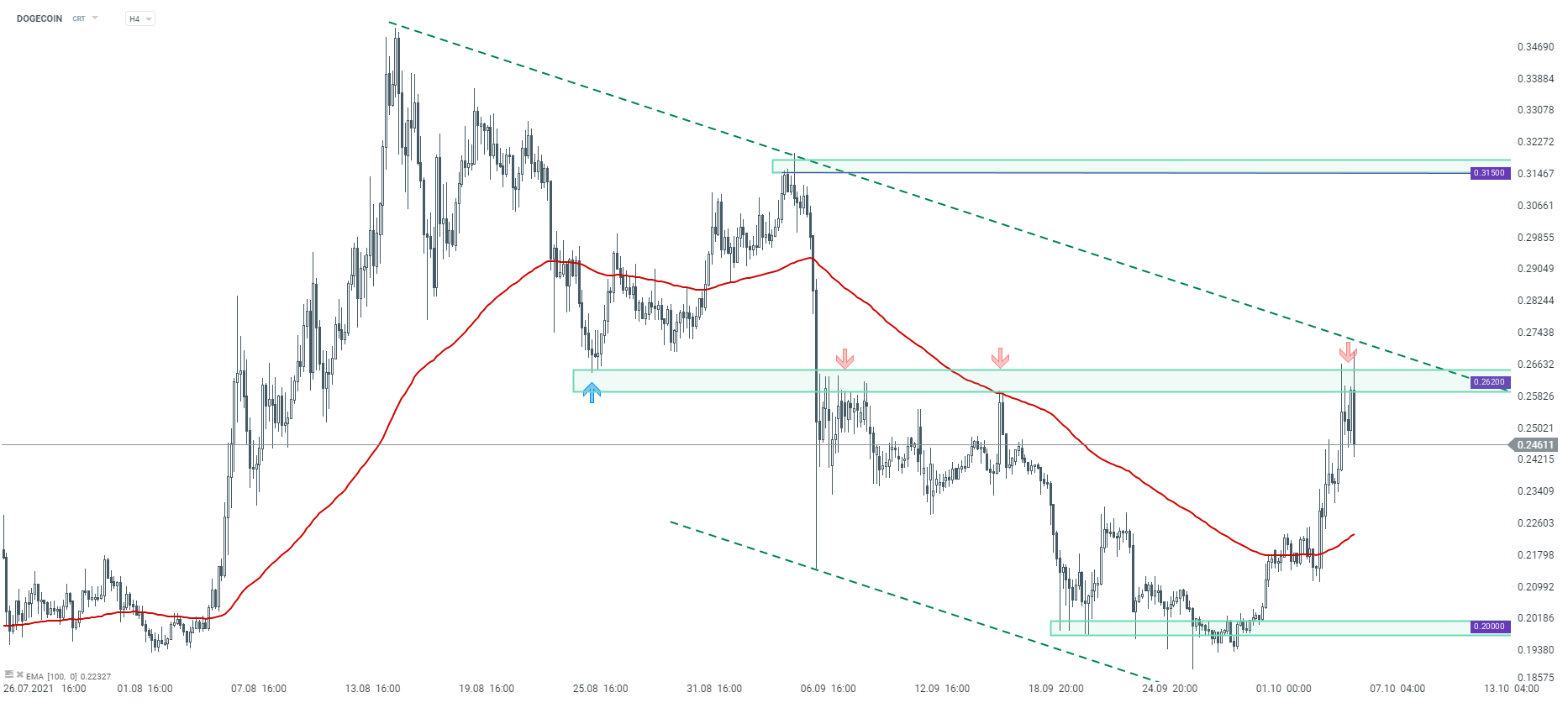 Spoglądając na wykres DOGECOIN, możemy zauważyć, że moneta skoczyła o około 40% od najniższych poziomów osiągniętych pod koniec września. Dzisiaj moneta ponownie przetestowała wczorajsze dzienne maksima powyżej 0,2660. Wzrosty nie trwały jednak długo, aktualnie możemy obserwować odbicie od wspomnianej strefy oporowej. Wspomniany obszar wynikał nie tylko z wczorajszych maksimów, ale również z poprzednich reakcji cenowych. Nieco powyżej znajduje się także linia trendu spadkowego. Wydaje się, że dopiero wybicie się powyżej niej mogłoby otworzyć drogę do większych wzrostów.
