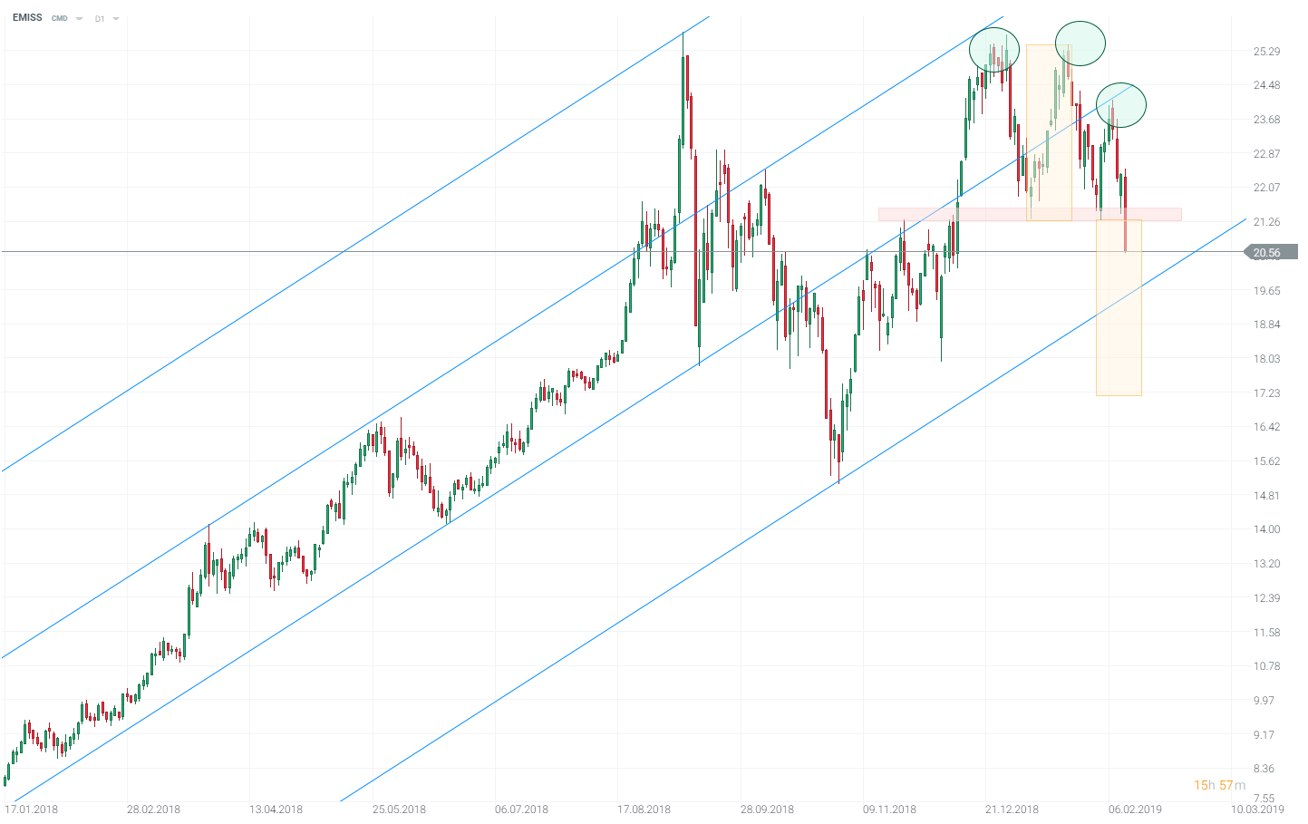 Ceny emisji – zmora polskiej energetyki – rosły bardzo mocno przez większość 2018 roku. Na początku obecnego roku ubiegłoroczny szczyt został przetestowany dwukrotnie, jednak cena nie wzrosła mocniej. To zaowocowało formacją podwójnego szczytu z dość jasno zarysowaną podstawą na poziomie 21,50. Ta podstawa została wczoraj przełamana. Książkowy zasięg formacji to 17,15, jednak jakiekolwiek wsparcia mamy raczej niżej: w strefie 14,15 – 16,60.