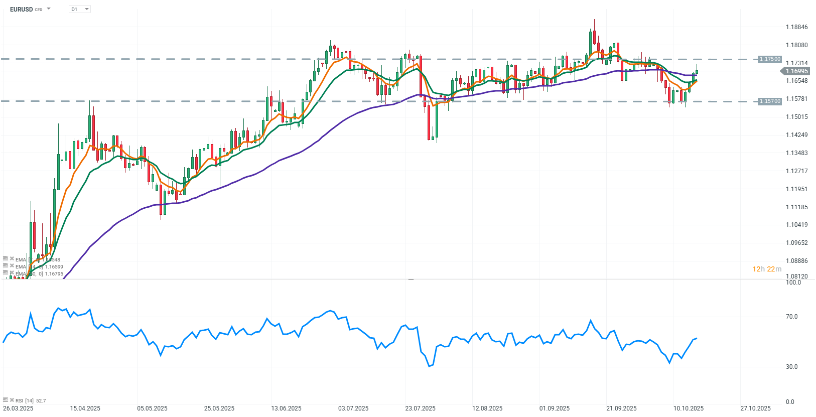 EUR/USD rośnie o 0,15% do około 1,16995, korzystając z poprawy sytuacji politycznej we Francji oraz słabości dolara na tle obaw o sektor bankowy w USA. Od początku tygodnia para zyskuje, a inwestorzy z uwagą obserwują nadchodzące dane z Europy oraz plany spotkania prezydentów USA i Rosji, które mogą wpłynąć na nastroje rynkowe.