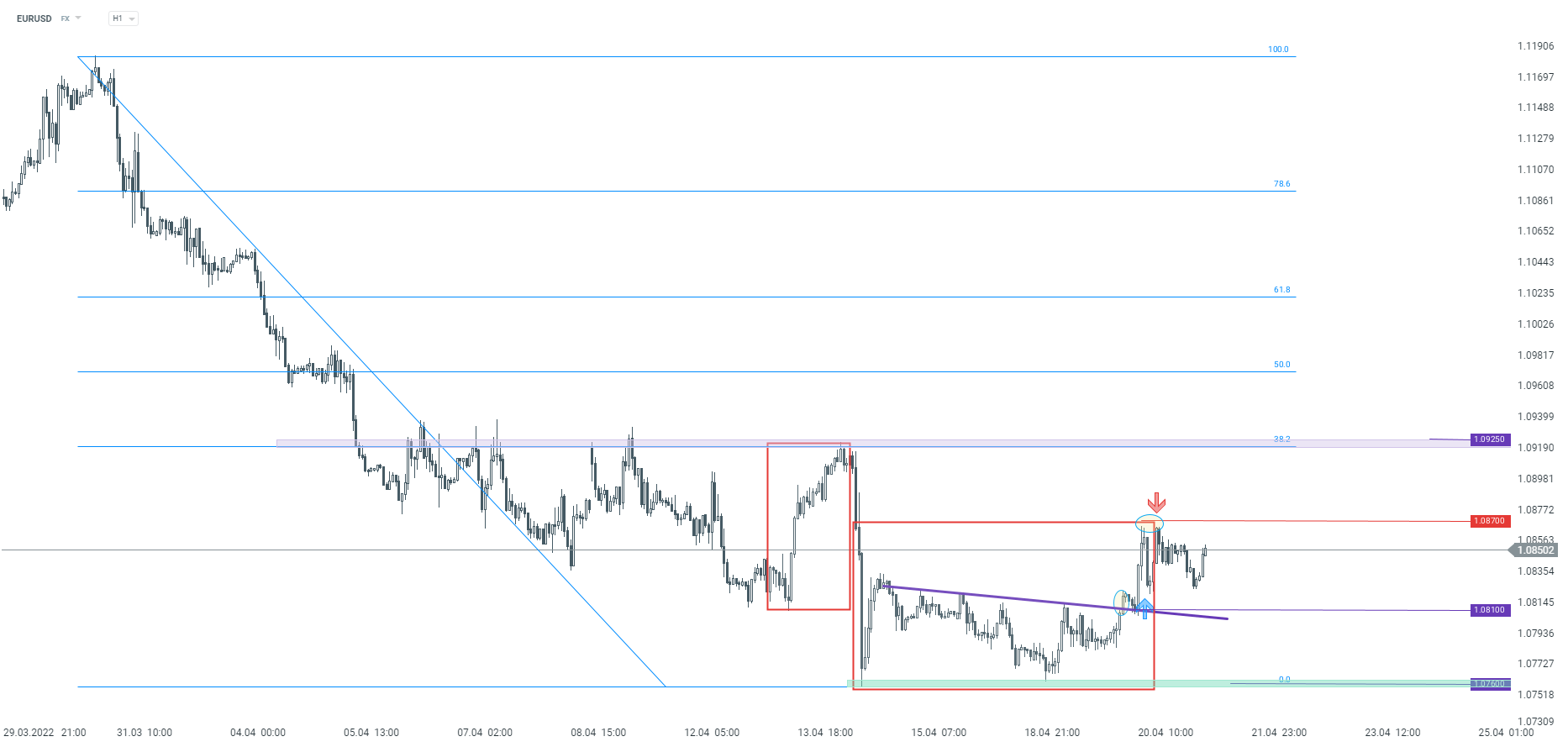 Patrząc technicznie na wykres H1, notowania zdołały przebić linię szyi lokalnej formacji odwróconej głowy z ramionami. Ruch korekcyjny zatrzymał się jednak w rejonach górnego ograniczenia układu 1:1, które pozostaje kluczowym oporem w krótkim terminie. Dopiero jego zanegowanie, mogłoby otworzyć drogę do większego odreagowania. Kolejny ważny opór wypada przy współczynniku 38,2% Fibo - okolice 1,0925.