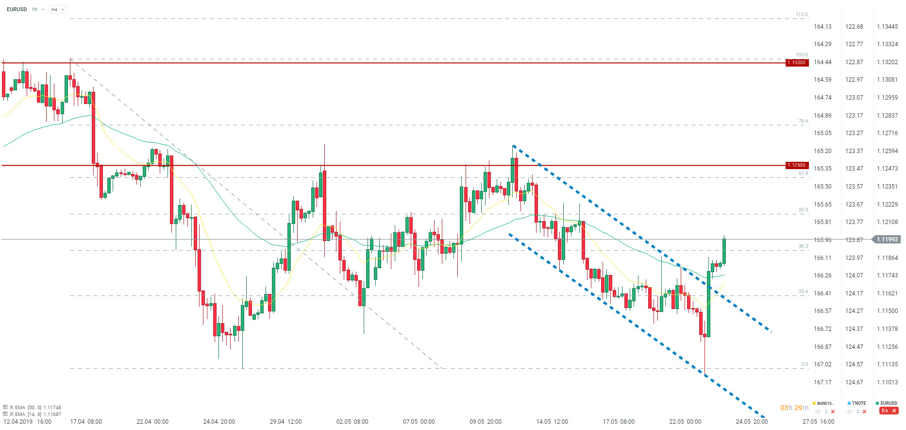 Na miano wykresu dnia zasługuje w zasadzie kilka aktywów. Mogłaby być nim ropa ze względu na ogromny spadek cen wczorajszego dnia, który determinuje ten tydzień jako jeden z najgorszych w ostatnich miesiącach. Mocnymi spadkami charakteryzowały się również indeksy. Niemniej duże ruchy widać również na EURUSD. Wczorajsze najpierw silne spadki w odpowiedzi na słabe dane ze strefy euro, a następnie fatalne dane z USA. Indeksy PMI runęły w dół meldując się blisko poziomu 50 punktów, co pokazuje, że spowolnienie ma również miejsce w USA i tak naprawdę mogło się dopiero rozpocząć. Dzisiaj widzimy kontynuację wzrostów, co może być wynikiem przegranej eurosceptyków w wyborach do Europarlamentu w Holandii.