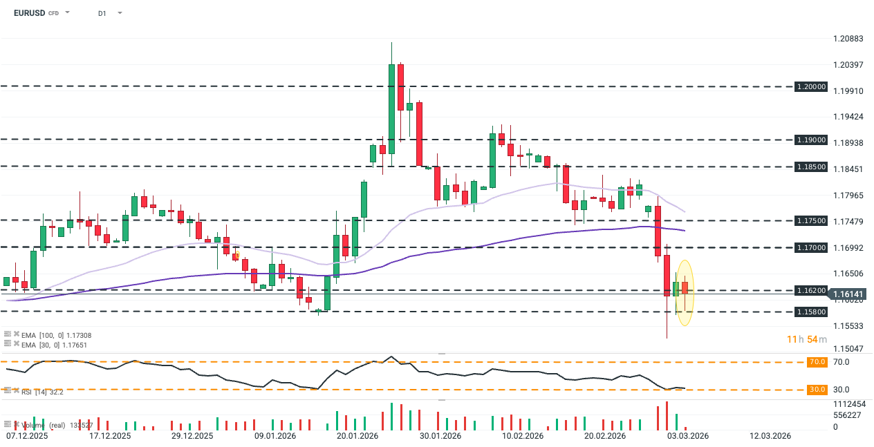 Kurs EURUSD wrócił powyżej 1,1610 pomimo wyraźnej presji spadkowej podczas sesji azjatyckiej. RSI szoruje po granicy wyprzedania, a wolumen pozostaje przytłumiony, co sugeruje niechęć ostrożność przed zawieraniem dużych transakcji przy presji geopolitycznej, oczekiwaniu na minutki EBC oraz jutrzejszy raport NFP. Źródło: xStation5