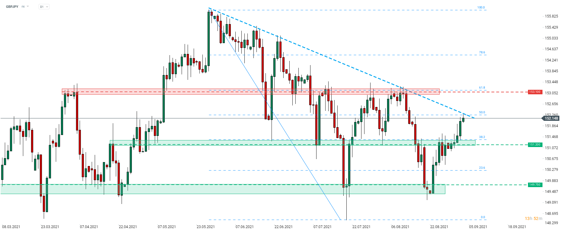 Spoglądając na wykres GBPJPY widzimy, że para przedłużyła dziś ruch wzrostowy i dotarła do ważnego obszaru oporu. Poziom 50% zniesienia ostatniej korekty oraz linia trendu spadkowego znajdują się w rejonie 152,25. Wybicie powyżej tej przeszkody mogłoby wskazywać na odwrócenie trendu. Jednakże, aby to potwierdzić, potrzebne byłoby przełamanie powyżej zniesienia 61,8% Fibo na poziomie 153,10, ponieważ pokrywa się ono z linią formacji podwójnego dna. Podręcznikowy zasięg wybicia z tej formacji wskazuje na ruch w kierunku maksimów z końca maja 2021 roku.