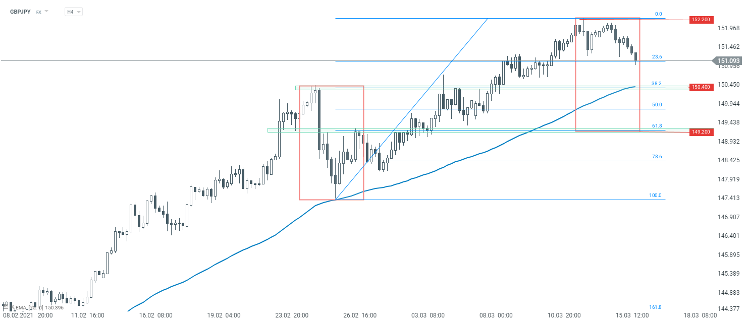 Notowania GBPJPY utrzymują się w ostatnim czasie w trendzie wzrostowym. Jednak pod koniec ubiegłego tygodnia inicjatywę przejęli sprzedający, przez co lokalnie obserwujemy korektę spadkową. Jeżeli ruch w dół się pogłębi, należy wziąć pod uwagę dwie strefy wsparcia. Pierwsze miejsce, gdzie ponownie mogą uaktywnić się kupujący wypada przy poziomie 150,40, czyli na wysokości ostatniego potwierdzonego szczytu. Gdyby przecena była większa, kolejne istotne wsparcie wypada na wysokości dolnego ograniczenia układu 1:1, które grupuje się z mierzeniem 61,8% Fibonacciego - poziom 149,20.