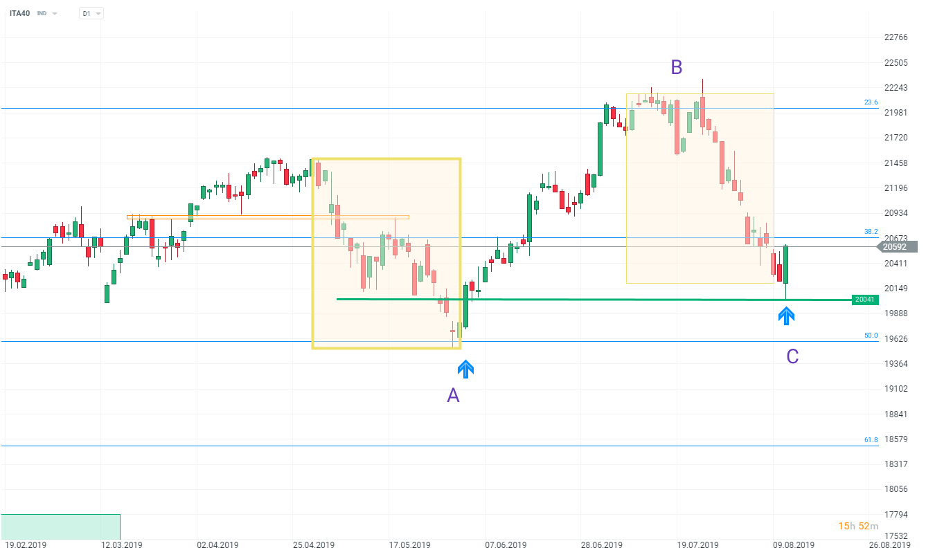 Ostatnie dni nie były dobre dla włoskiego rynku akcji. Globalne niepokoje zostały wzmocnione lokalnymi wydarzeniami na scenie politycznej, gdzie wydaje się, że wybieramy pomiędzy przyspieszonymi wyborami teraz a na wiosnę (co chyba jest jeszcze gorszym scenariuszem). W dużej mierze zostało to jednak wycenione, a wczorajszy impuls globalny idealnie wpisał się w sytuację techniczną na ITA40 i ma szansę na zakończenie korekty pędzącej.