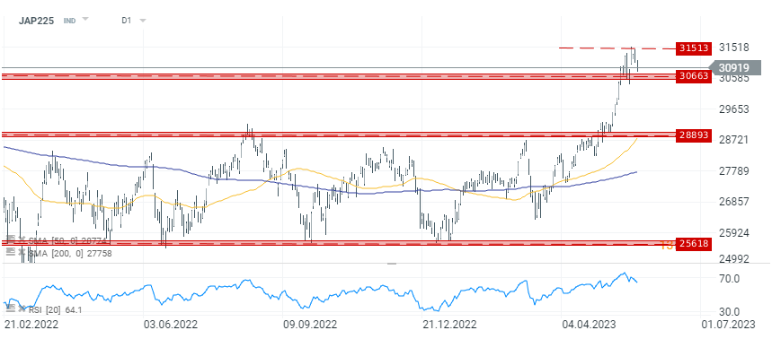 Zaledwie cztery sesje temu Nikkei 225 wyznaczył historyczne szczyty i znalazł się blisko 30 letnich maksimów po osiągnięciu wstępnego porozumienia w sprawie limitu zadłużenia w USA. Co więcej, paliwa do wzrostów dolała euforia na akcjach z sektora układów scalonych i AI. Japonia widzi w nich potencjał na rozwój gospodarczy kraju. Motorem napędowym wzrostów był Advantest, producent sprzętu dla Nvidia, Nikon oraz SoftBank. Władze z Tokio zapewniły w ostatnim czasie dotacje dla globalnych firm z sektora chipów jak Taiwan Semiconductor Manufacturing (TSM.US) na budowę nowych fabryk lub rozbudowę istniejących.