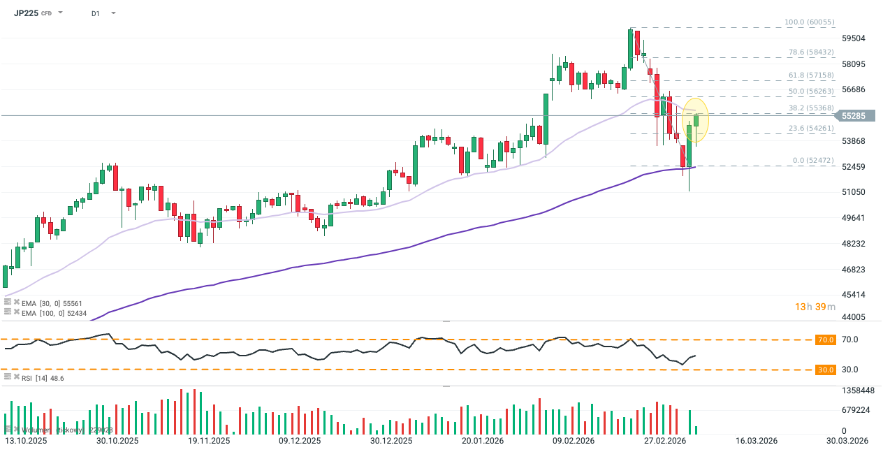 Kontrakt na japoński indeks giełdowy Nikkei 225 (JP225) przedłuża wczorajsze odbicie o dodatkowe 0,9%, zbliżając się do byczego testu 30-dniowej wykładniczej średniej kroczącej. Optymizm w sesji azjatyckiej to nie tylko zasługa dużych oczekiwań wobec deeskalacji konfliktu na Bliskim Wschodzie po słowach Donalda Trumpa, ale również świetnych danych, które po raz pierwszy od dłuższego czasu dają nadzieję na odbicie gospodarcze w Japonii.
