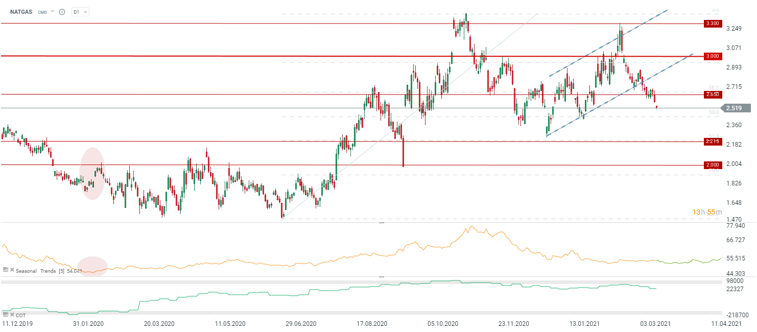 Dzisiaj gaz ziemny otwiera się luką spadkową i obecnie traci ponad 2,2%. Gaz wobec tego przełamuje bardzo ważne wsparcie w okolicy poziomu 2,65 USD MMBTU. Ostatnio zapasy gazu spadły mniej od oczekiwań, produkcja w USA powraca do normalnych poziomów, a sezon grzewczy chyli się ku końcowi. Wobec tego, nie widac obecnie perspektyw na dalsze wzrosty cenowe. Sezonowość pokazuje na perspektywę spadków w najbliższym czasie.