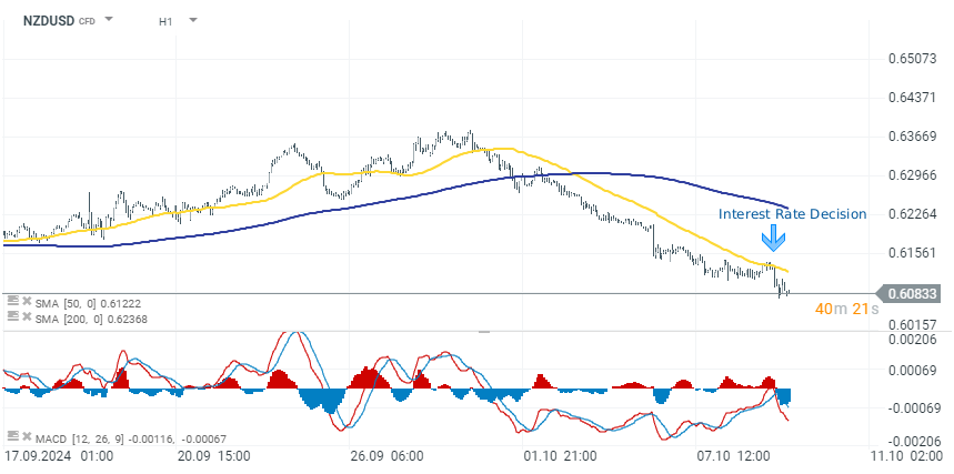 Para walutowa NZDUSD znacznie spadła po decyzji, tracąc około 0,90% do poziomu 0,60800. Dolar nowozelandzki spadł dziś o 0,7% w stosunku do innych walut G10.