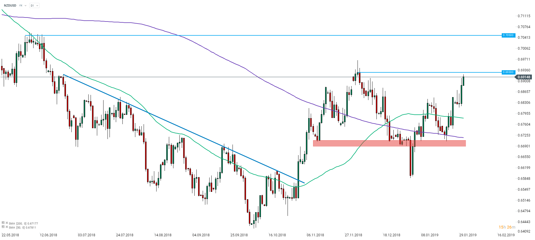 NZDUSD kontynuuje rajd rozpoczęty na początku 2019 roku. Ułożenie średnich kroczących sprzyja bykom. Kluczowa w kontekście najbliższych dni będzie reakcja pary na grudniowy szczyt przy poziomie 0,6930. Źródło: xStation5