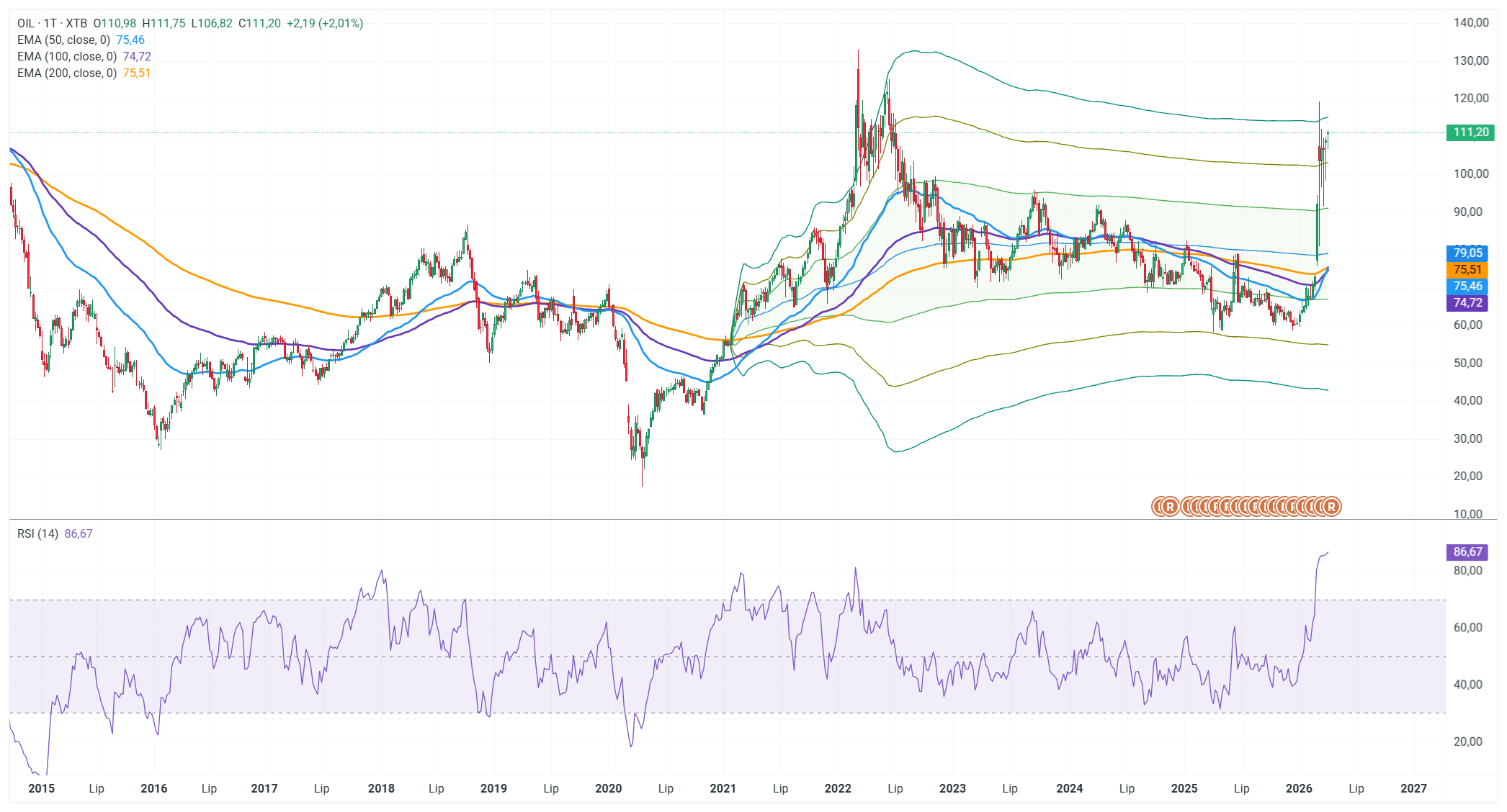 Wzystkie trzy kluczowe średnie kroczące — EMA 50, EMA 100 i EMA 200 — skupione są wciąż w okolicach $74–79, co oznacza, że aktualna cena handluje z premią ponad 45% powyżej długoterminowych średnich, co jest stanem skrajnie odchylonym od historycznej normy. RSI(14) wynosi aż 86,67 — poziom wykupienia, wyraźnie przekraczając szczyty RSI z 2022 roku. Na ten moment jednak zamieszanie wokół niepewnego wyniku rozmów USA-Iran nie pozowalają na zmniejszenie presji popytowej na surowcu. Źródło: xStation