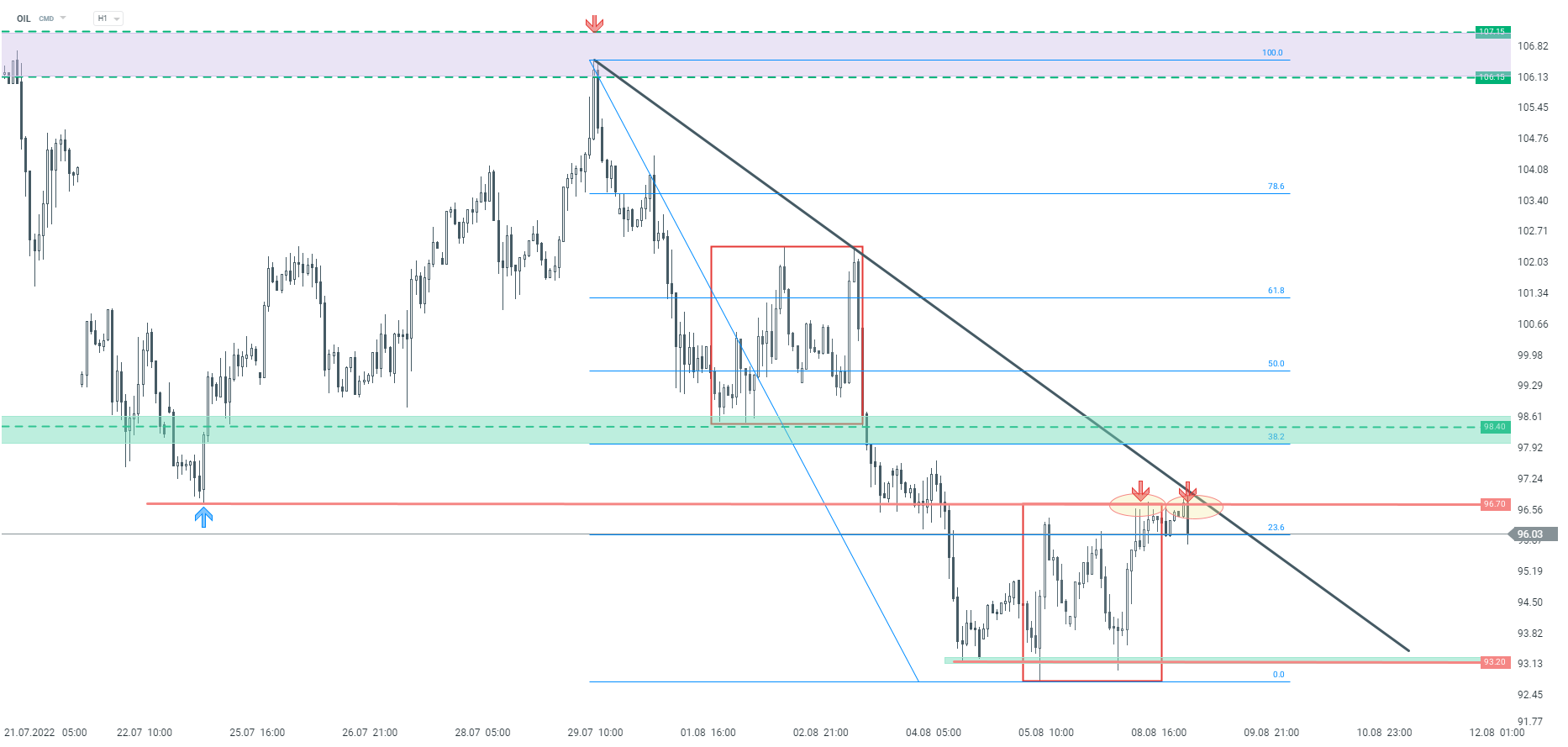 Dziś późnym wieczorem poznamy raport API dotyczący zapasów ropy, co może mieć wpływ na zachowanie cen czarnego złota. Jeśli chodzi o sytuację techniczną, notowania ropy naftowej poruszają się ostatnio w tendencji spadkowej. Patrząc na interwał H1, ostatnia korekta dotarła do kluczowego oporu przy 96,70. Poziom ten był testowany już wczoraj, a dziś ponownie pojawili się tutaj sprzedający. Wspomniany opór wynika z górnego ograniczenia układu 1:1, dołka z 25 lipca oraz linii poprowadzonej po ostatnich wierzchołkach. Jeśli poziom zostanie wybroniony, niewkluczona jest kontynuacja spadków. Z kolei ważne wsparcie znajduje się dopiero przy 93.20 i wynika z ostatnich minimów. Z drugiej strony, kolejny ważny opór wypada przy 98,40. Dopiero jego zanegowanie mogłoby zmienić sentyment na wzrostowy.