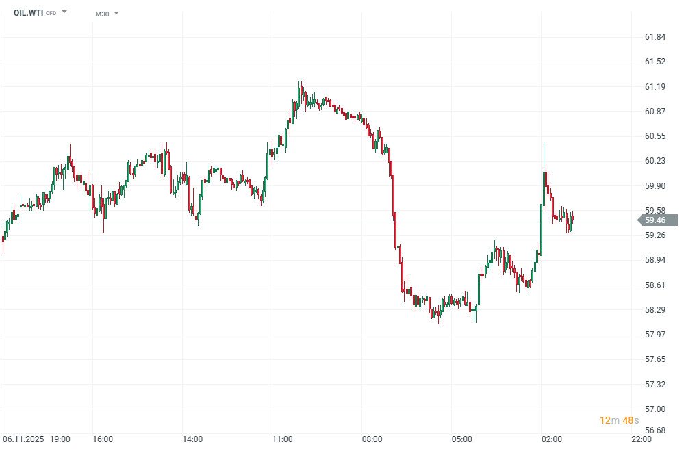 Choć ceny Brent i WTI początkowo wzrosły nawet o 2,50% we wczesnych godzinach handlu do poziomu 60,50 USD za baryłkę, ogólne nastroje rynkowe pozostają stonowane. Obecnie ropa pozostaje 1,40% wyżej w ujęciu dziennym – na poziomie 59,40 USD.