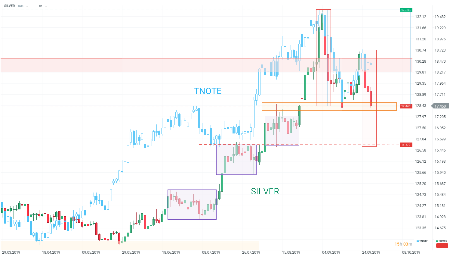 Ten tydzień rozpoczął się potężnymi wzrostami cen srebra w reakcji na fatalne dane makro z Europy, ale silny dolar i dość lekkoduszna reakcja rynków akcji doprowadziły do zmiany sentymentu. Dane o dość wysokiej inflacji (względem oczekiwań) oraz wzroście aktywności na rynku mieszkaniowym w USA istotnie wsparły dolara, jednak patrząc na rentowności taka skala przeceny kruszców nie wydaje się uzasadniona. Dlatego też obecne wsparcie jest szansą na powrót do wzrostów, ale uwaga – może zrealizować się też głębsza korekta ABC (mniej realny scenariusz, ale warty rozważenia), który sprowadziłby cenę w okolice silnego wsparcia 16,50.
