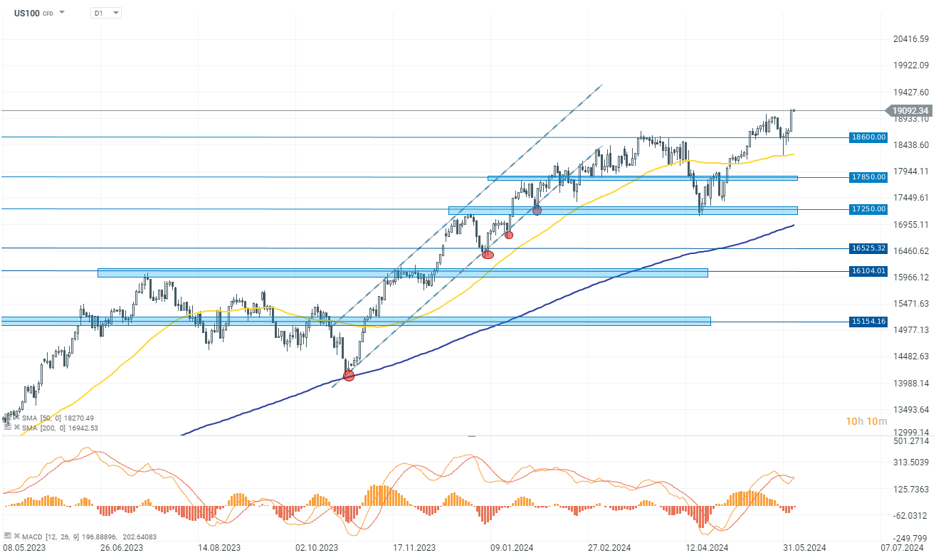 Kontrakty US100 na indeks spółek technologicznych Nasdaq100 zyskiwały wczoraj na zamknięciu sesji ponad 2,00% przebijając się powyżej poziomu 19000 punktów oraz ustanawiając nowy historyczny rekord na zamknięciu sesji. Wzrosty są napędzane spółkami technologicznymi “wspaniałej 7”, które w ostatnim czasie ciągną indeksy do góry.