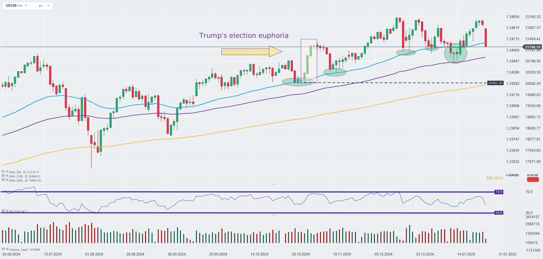 Skala spadków na indeksie US100 jest dzisiaj naprawdę pokaźna i wynosi aż 3%. Zasięg spadków pozwolił obecnie na przebicie się poniżej 50- dniowej EMA (niebieska krzywa na wykresie). Z technicznego punktu widzenia indeks ten cały czas jednak znajduje się w długoterminowym trendzie wzrostowym. Źródło: xStation