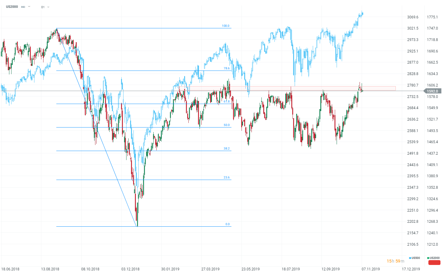 Relacje USA-Chiny zaczynają przypominać operę mydlaną. Chińczycy zdali sobie sprawę, że Trump (przegrywający w trwającej przecież już kampanii) sam uczynił z siebie niewolnika indeksów giełdowych i sami wydali oświadczenie, iż strony zgodziły się na redukcję ceł jako część wstępnego porozumienia. Gdyby Trump zdementował, wysłałby indeksy wyraźnie na południe, dlatego amerykańska strona potwierdziła te informacje. Jednak w nocy nadeszły informacje, że taka postawa wywołuje coraz większy sprzeciw w Białym Domu (zapewne ze strony Lighthizera). Warto przy okazji zauważyć, że w przeciwieństwie do spółek z S&P500, mniejsze spółki z Russela2000 raportują wyraźnie rozczarowujące wyniki na poziomie sprzedaży. US2000 w przeciwieństwie do US500 jest nie tylko daleki od rekordowych poziomów, ale nie odrobił nawet 75% spadków z jesieni ubiegłego roku. Czy strefa oporu po raz kolejny okaże się barierą nie do przejścia?