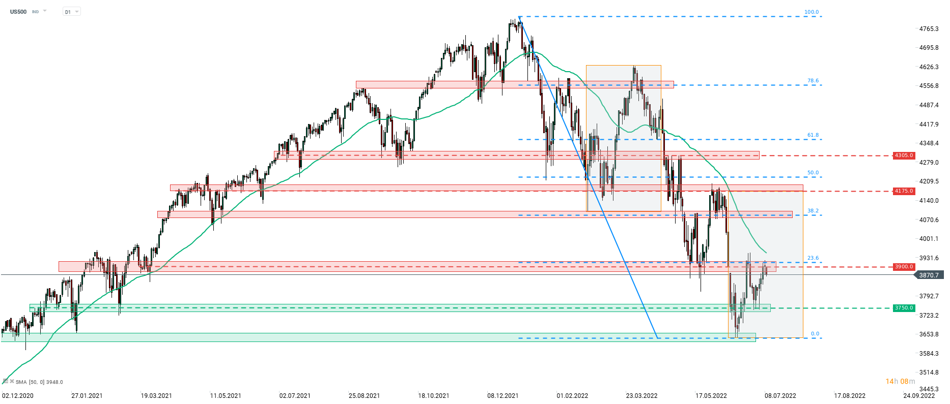 Spoglądając na indeks S&P 500 (US500) na interwale D1, widzimy, że ostatnia korekta wzrostowa została ponownie zatrzymana na strefie oporu blisko poziomu 3900 pkt. Obszar ten jest dodatkowo wzmacniany przez zniesienie 23.6% impulsu spadkowego zapoczątkowanego na początku roku. W dniu dzisiejszym można zaobserwować cofnięcie i jeśli będzie ono kontynuowane, pierwsze wsparcie w najbliższym czasie można znaleźć w rejonie 3750 pkt. Z drugiej strony, jeśli byki odzyskają kontrolę i zdołają wybić się ponad wspomnianą strefę 3900 pkt, ruch w górę może się przedłużyć. W takim przypadku kluczowy średnioterminowy opór znajduje się w rejonie 4175 pkt i jest wyznaczony przez górne ograniczenie struktury Overbalance.