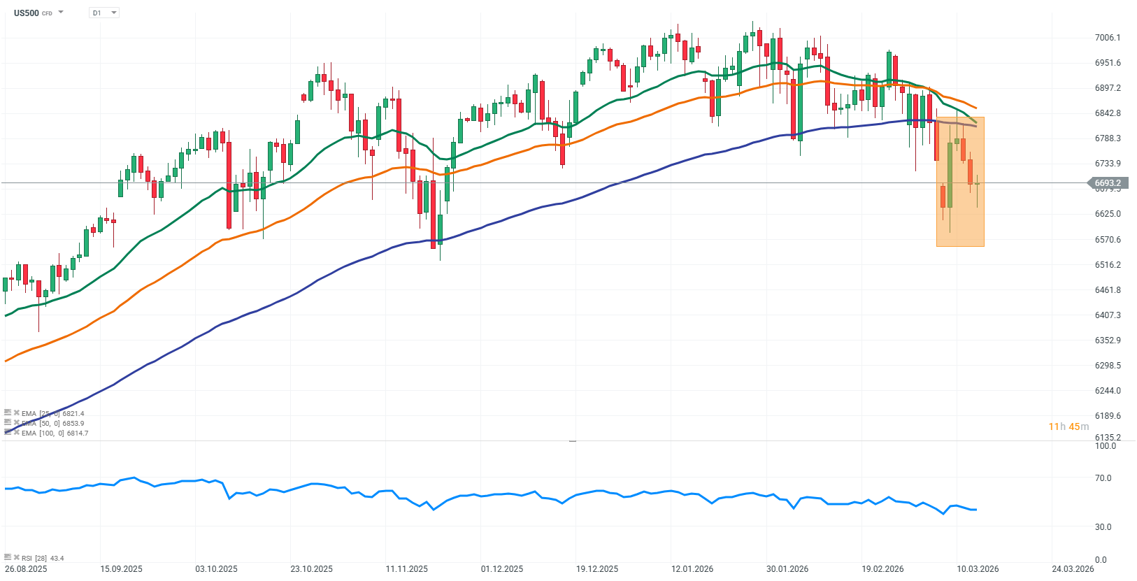 Notowania kontraktów US500 na indeks S&P 500 pozostają wrażliwe na kombinację czynników makroekonomicznych i sektorowych, przy czym największą uwagę inwestorów przyciągają dane PCE, wysokie ceny ropy oraz spółki związane z AI. Indeks oscyluje w okolicach ważnych wsparć technicznych, a rynki globalne nadal podlegają zmienności wywołanej zarówno czynnikami geopolitycznymi, jak i makroekonomicznymi. W krótkim terminie inwestorzy szukają sygnałów, które mogłyby wskazać kierunek dalszych ruchów indeksu. Połączenie danych makro i narracji technologicznej w dużej mierze determinuje dzisiejsze nastroje na rynku.
