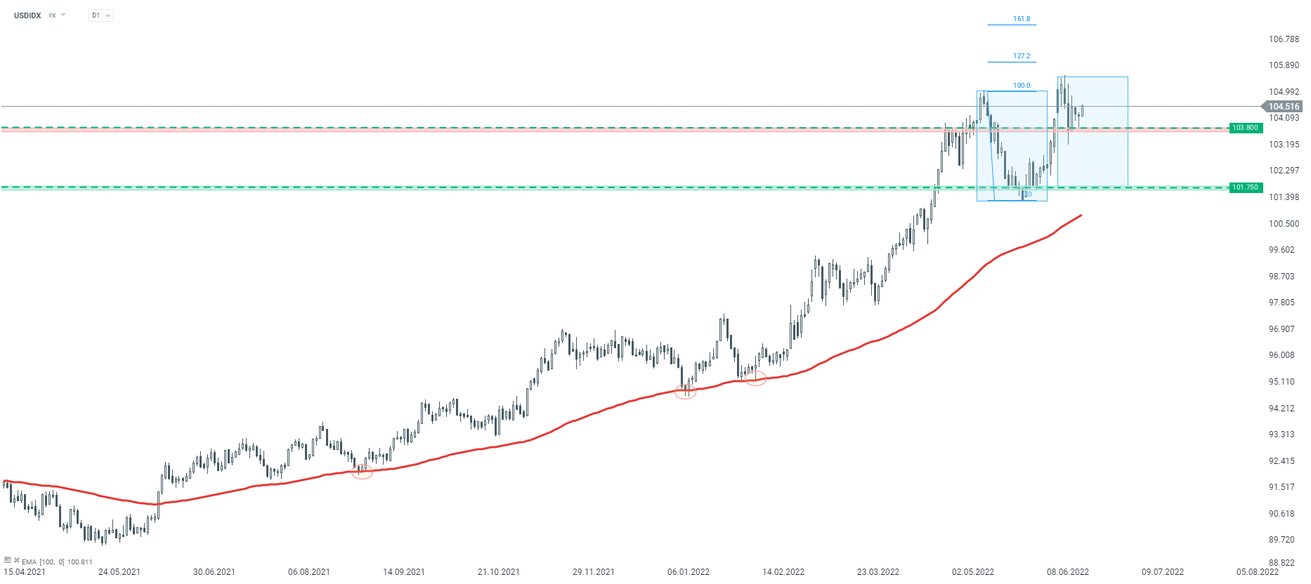 Patrząc technicznie na wykres indeksu dolara na interwale dziennym, możemy zauważyć, że od dłuższego czasu porusza się on w trendzie wzrostowym. Aktualnie kluczowa wydaje się strefa wsparcia przy poziomie 103,80. Wynika ona nie tylko z ubiegłotygodniowych minimów, ale także ze szczytów z 2016 i 2020 roku. Jeżeli zostanie ona utrzymana, dalsza wędrówka na wyższe poziomy wydaje się scenariuszem bazowym. Gdyby jednak sentyment uległ zmianie i wsparcie przy 103,80 zostałoby zanegowane, celem dla ruchu korekcyjnego stanie się strefa przy 101,75, gdzie znajduje się dolne ograniczenie układu 1:1.