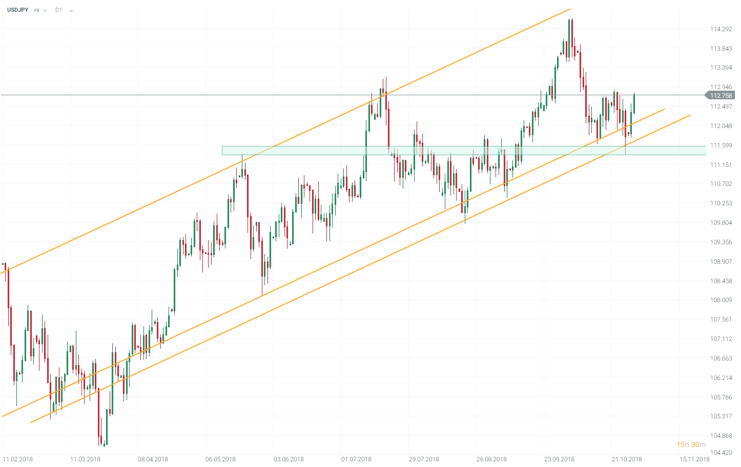 Rynek USDJPY w ostatnim czasie nieco zaskakiwał ponieważ zwykle w czasie silnych spadków na giełdach jen jest bardzo mocny. Tym razem owszem, mieliśmy tu spadek z ponad 114 w okolice 111,50, ale to wszystko na co było stać sprzedających. Pomimo faktu, iż korekty na giełdach nie można uznać jeszcze za zakończoną, to na USDJPY mamy wyraźne odbicie. Odbicie to nie tylko odsuwa nas od dolnego ograniczenia kanału wzrostowego, ale także od horyzontalnego wsparcia na poziomie 111,35. Patrząc na sam wykres oznaczałoby to perspektywę ataku na nowe szczyty, patrząc szerzej do takiego scenariusza konieczny wydaje się powrót optymizmu na rynki globalne.