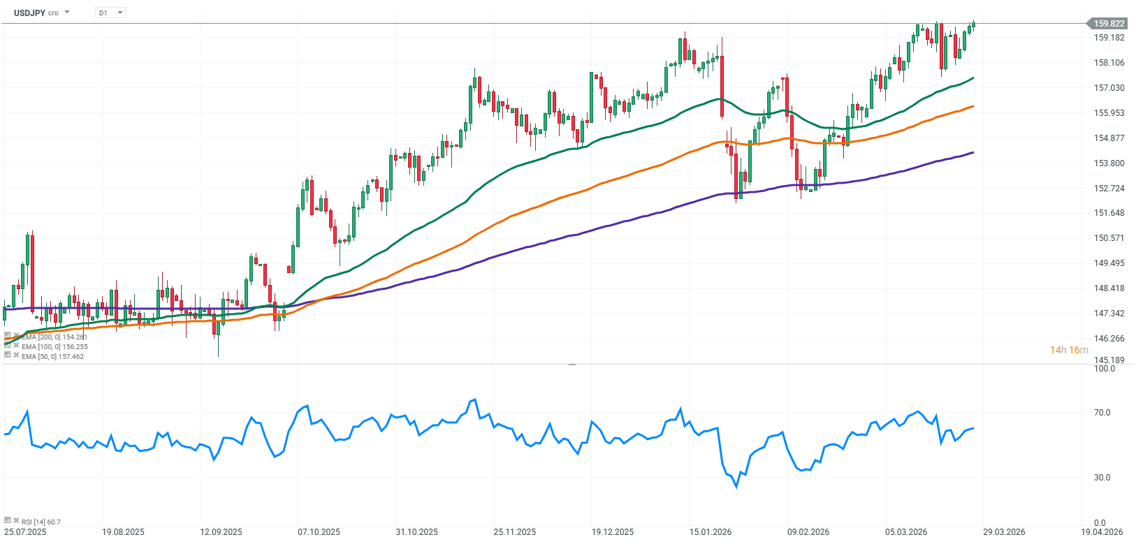 USDJPY pozostaje wrażliwe na kombinację siły dolara, sygnałów interwencyjnych ze strony japońskich władz oraz czynników zewnętrznych, takich jak ceny energii i napięcia geopolityczne. Silny dolar i możliwe działania władz Japonii ograniczają potencjał stabilnych wzrostów powyżej 160,00.