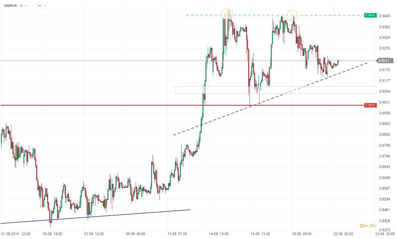 Połowa sierpnia przyniosła skokowe osłabienie złotego, przez co kurs USDPLN wzrósł w pobliże poziomu 3,95. Ten poziom był ponownie testowany w poniedziałek i wtorek, jednak widać, że stał się barierą dla kupujących. Tworzy nam się zatem zalążek formacji podwójnego szczytu, dość mocno wyraźnego na interwale H1, jednak do jego realizacji potrzebny jest szybki marsz poniżej 3,90. Brak zdecydowania sprzedających pozostawi parę w formacji trójkąta, która w tym przypadku byłaby formacją kontynuacji trendu. Fundamentalnie dolarowi może sprzyjać brak przekonania Fed co do potrzeby pilnej stymulacji (co pokazały wczoraj minutes), choć kluczowa będzie wymowa wystąpienia Powella podczas sympozjum w Jackson Hole.
