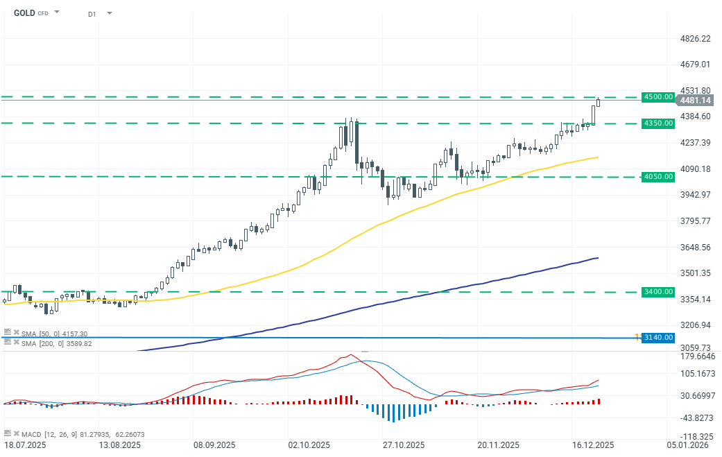 Od strony technicznej kontrakt na złoto przebił kluczowy opór w okolicach 4350 USD, wpisując się w obowiązujący kanał wzrostowy, a utrzymanie się powyżej tego poziomu będzie kluczowe dla podtrzymania fali wzrostowej. Jednocześnie perspektywa dalszego luzowania polityki monetarnej obniża koszt alternatywny utrzymywania złota względem aktywów oprocentowanych, co – w połączeniu z kontynuacją zakupów przez banki centralne, zwłaszcza na rynkach wschodzących, oraz rosnącym zainteresowaniem inwestorów detalicznych – utrzymuje strukturalnie wysoki popyt na kruszec.