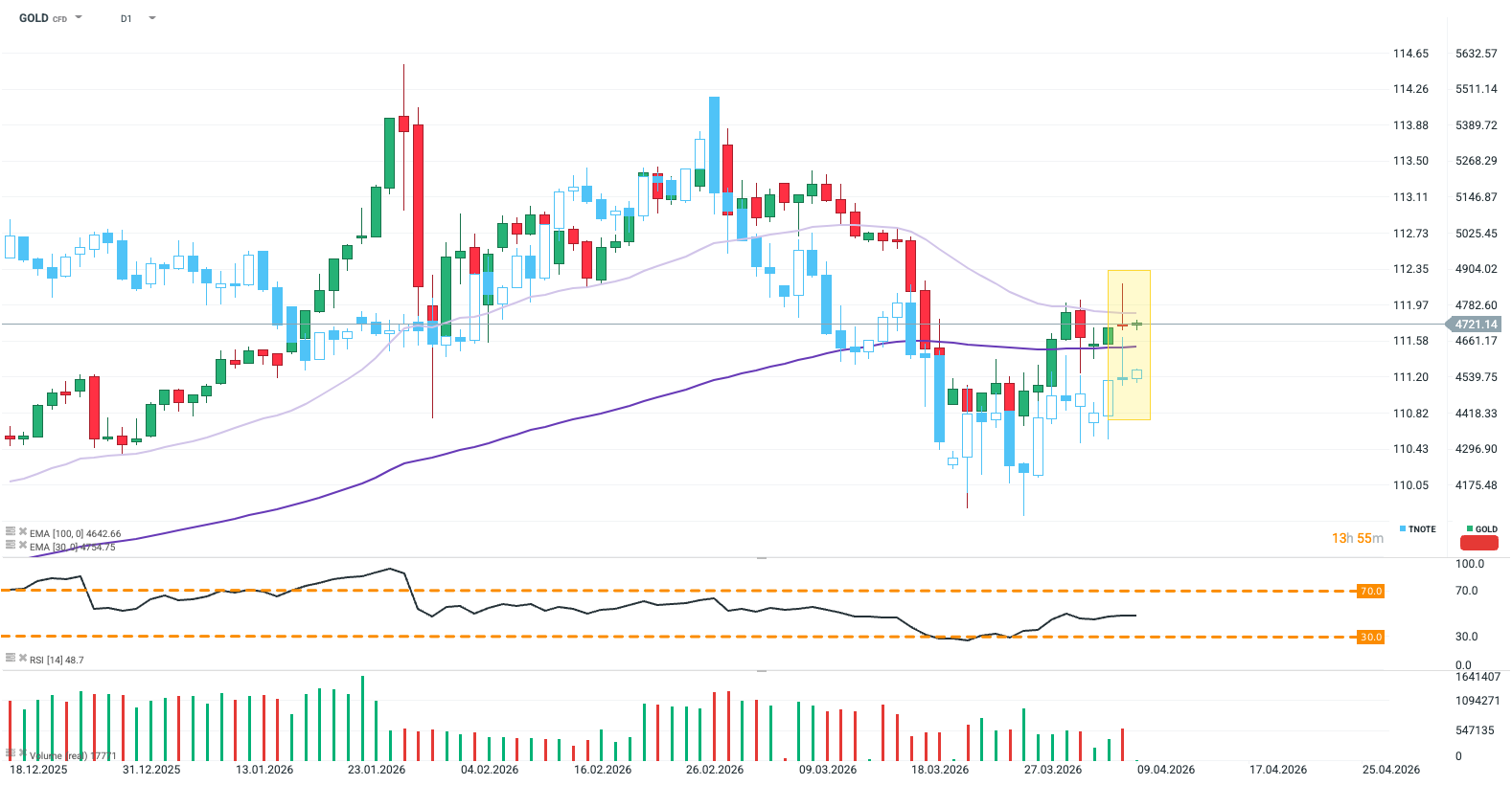 Po wyrysowaniu wczoraj formacji odwróconego młota, GOLD przykleił do poziomu 4720-4730. RSI pozostaje neutralne, lekko poniżej 50, co wskazuje na wyraźny brak kierunku na jednym z najbardziej zmiennych rynków ostatnich miesięcy. Te same obawy kształtują notowania 10-letnich obligacji USA (TNOTE, niebieski), które wstrzymują oddech przed dzisiejszym odczytem inflacji PCE. Źródło: xStation