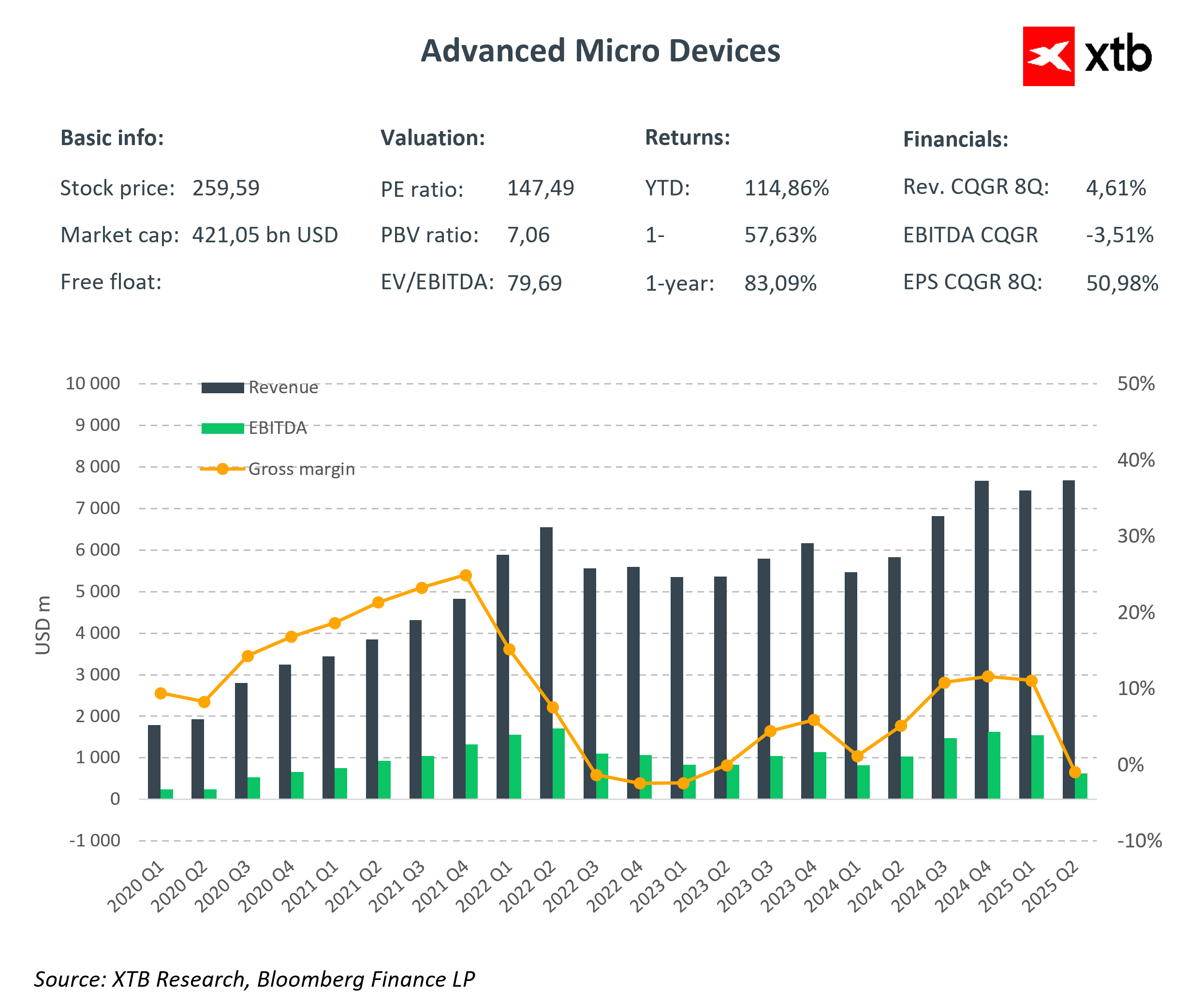 - Oczekiwany wzrost segmentu AI i Data Center: Prognozy wskazują na przychody ok. 4,14 mld USD (+17,6% r/r), napędzane procesorami EPYC i chipami MI350/MI450