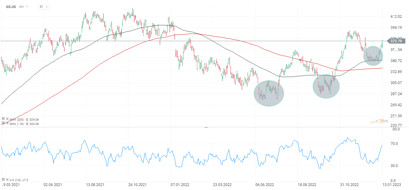 Akcje Goldman Sachs (GS.US) interwał D1. Cena akcji próbuje odwrócić trend na wzrostowy, zarysowując 'coraz wyższe dołki' i wzbijając się powyżej SMA 100 (czarny) i SMA 200 (czerwony). Kluczowym, krótkoterminowym oporem pozostają poziomy 390 USD za walor, wyznaczone przez poprzedni szczyt, natomiast kluczowe krótkoterminowe wsparcie stanowią poziomy SMA100, które zbiegają się z ostatnim dołkiem w okolicach 340 USD za walor. Źródło: xStation5