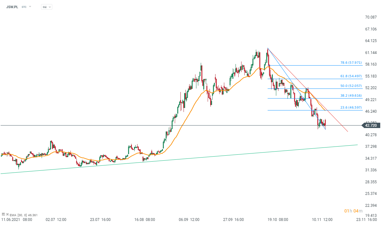 Wykres walorów spółki JSW (JSW.PL), interwał H4. Akcje firmy poruszają się obecnie w trendzie spadkowym i obecnie strona popytowa walczy o utrzymanie podwójnego dna na poziomie 41,8 zł za akcję. Jeśli poziom ten zostanie wybity dołem, możliwe będzie utrzymanie dominacji podaży aż do strefy wsparcia wyznaczonej przez roczny trend wzrostowy (zielona przerywana linia). Jeśli natomiast byki obejmą kontrolę nad walorami spółki, inwestorzy mogą doświadczyć testu poziomu 46,6 zł, który tworzą zniesienie 23,6 Fibo oraz obszar wcześniejszych reakcji cenowych. Źródło: xStation 5