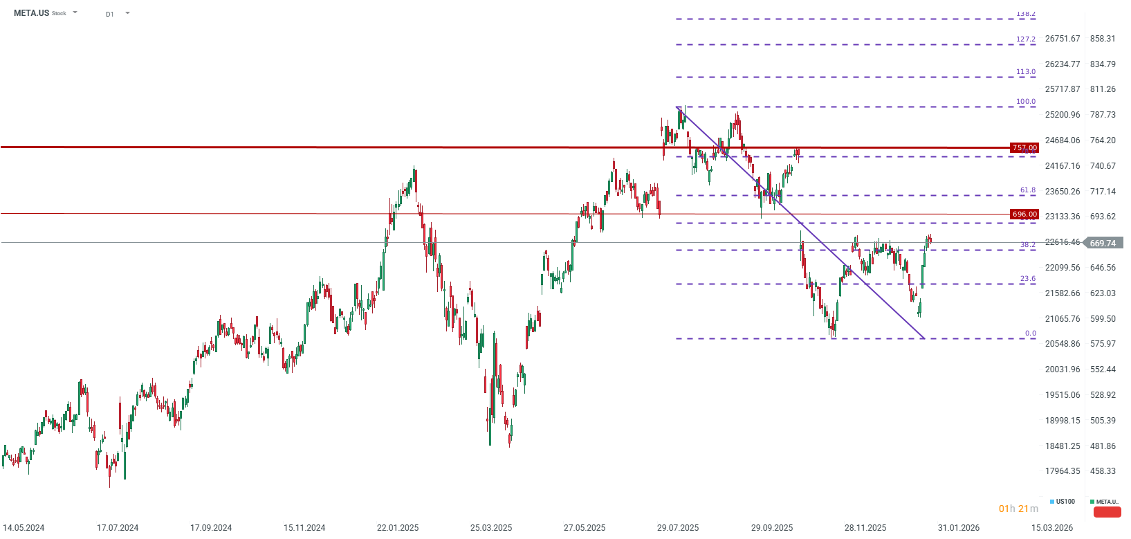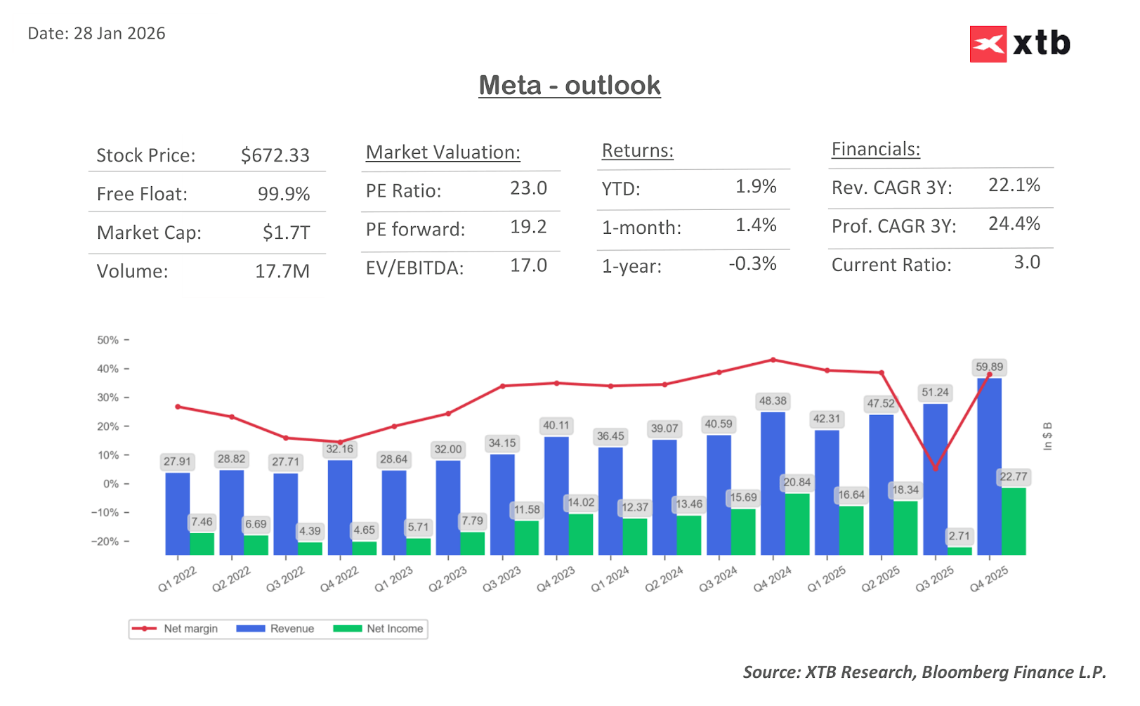 Warto jednak spojrzeć na sporą rysę na raporcie: spadek marży z 48% do 41% oznacza, że koszty operacyjne rosną szybciej niż przychody. Zuckerberg obiecuje, że rok 2026 będzie lepszy, ale to ryzykowny zakład. Jeśli inwestycje w AI nie przyniosą skokowego wzrostu efektywności, rok 2027 może przynieść bolesne rozliczenie.Warto jednak wspomnieć, że marża netto zaliczyła odbicie, więc wciąż można uznać, że sytuacja nie wygląda aż tak źle, patrząc jedynie na jedną liczbę